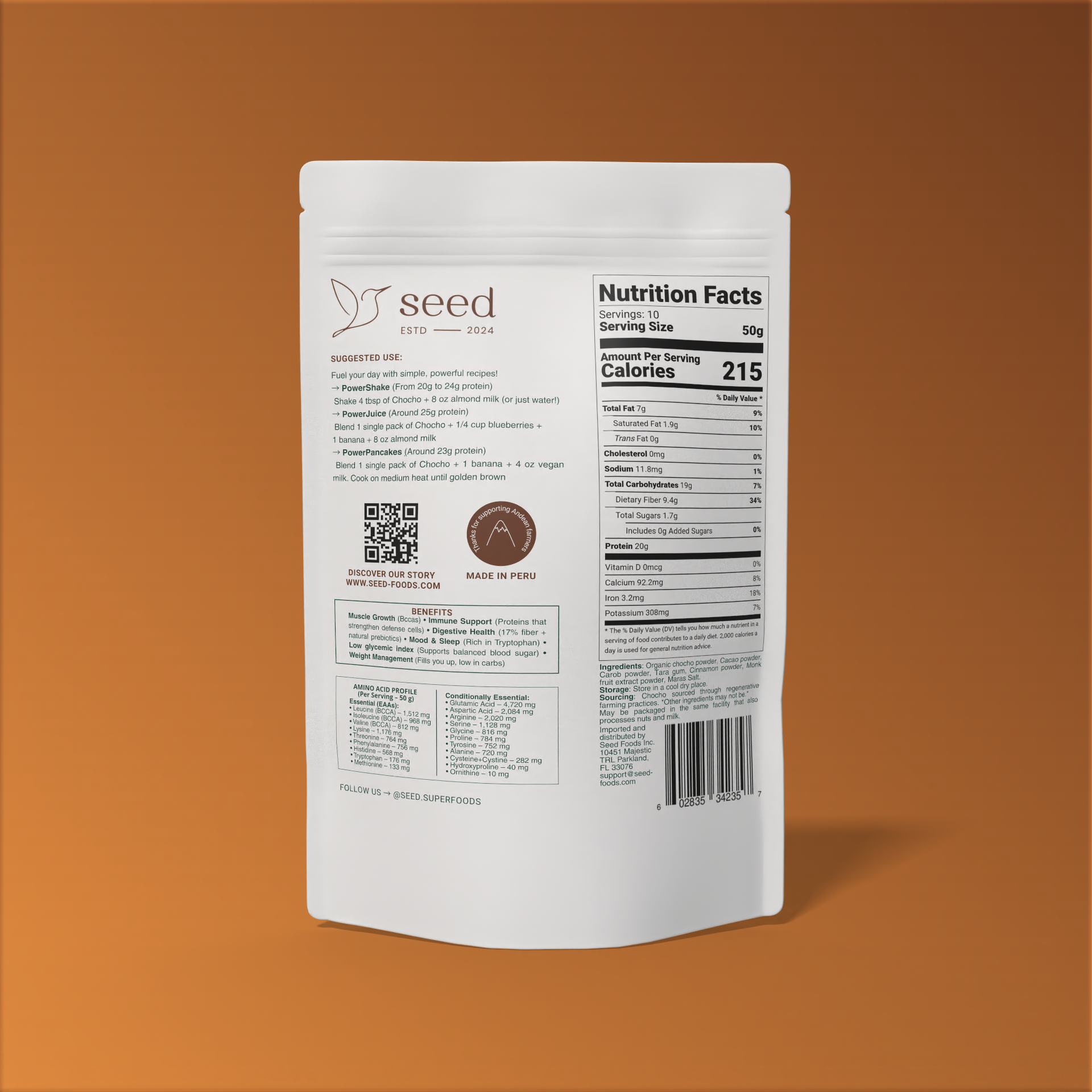 Packed with fiber, omegas, and plant-based protein, Cacao Chocho supports your energy, digestion, and recovery — with no added sugars, no gums, and no weird ingredients.